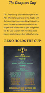 Without the penalty strokes my tournament total was 177 (91/86). The championship was decided in a playoff the year before. There was a crowd waiting near the club house and there was a stir of energy and anticipation. This year, most of the crowd was already on the buses or loading their gear into their cars. I found a couple of the Reno guys and we discussed the hole in one that one of our crew carded (the first ever hole in one at the MGAWC).
